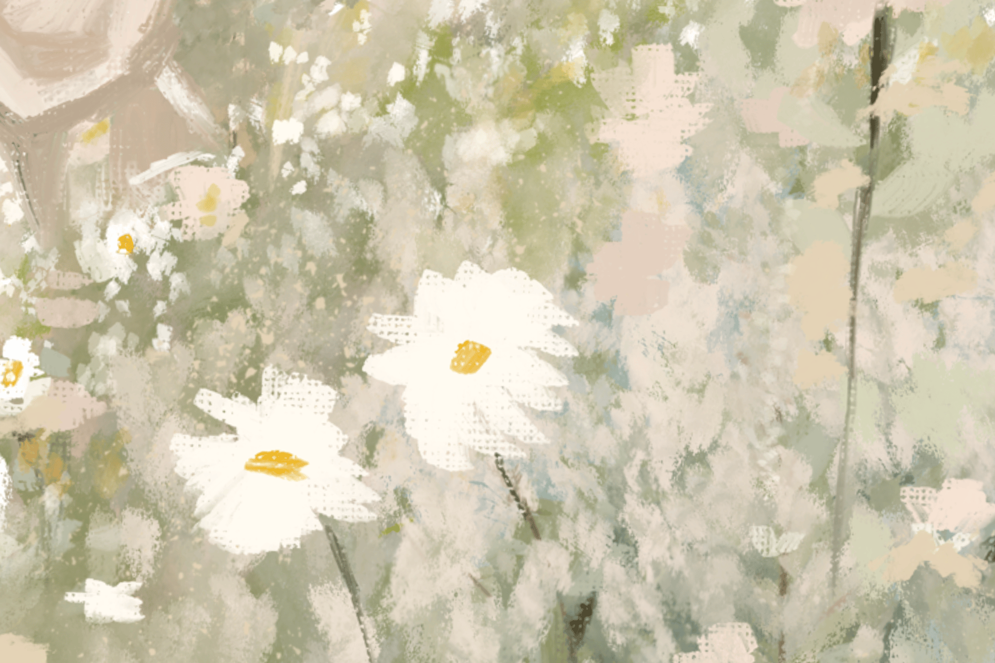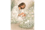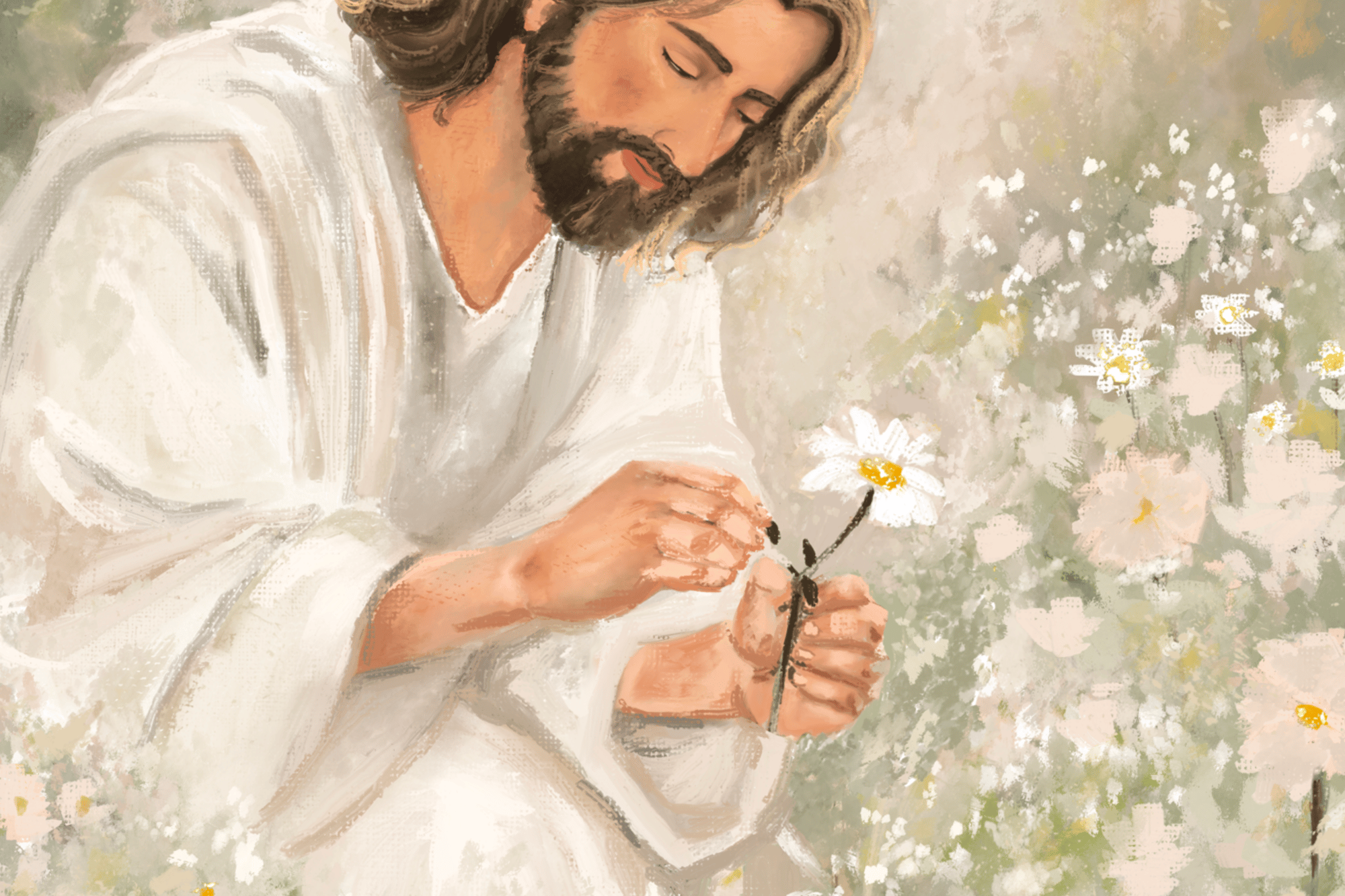 A peaceful, storybook-inspired depiction of Christ holding a small flower among the blooms—symbolizing the way He stays, repairs, and restores one piece at a time.